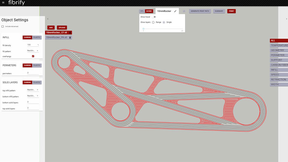 该技术由设计模块(Fibrify®设计套件)、构建模块(提供纤维铺层和预成型件生产的3D打印机)和融合模块(提供预成型件固结和最终零件成型的紧凑型压缩机)组成。其中,Fibrify®设计套件可导入CAD文件并运行FEA模拟,使用户能够快速定义纤维设计并验证和优化设计的结构能力。构建模块是一个开放式材料平台,能通过两个细丝导向器进行材料沉积,将热塑性细丝(例如PA11、PA12、PPS、PEKK和PEEK)与连续纤维增强细丝(例如碳、玻璃和玄武岩)放置在一起,并能精确决定纤维取向,充分利用各向异性的优势,在零件的不同区域或不同方向获得不同的机械性能。融合模块使用金属模具来加固打印出来的预成型件,增加层之间的粘合,将打印结构内的残留空隙降低至1%并实现极佳的表面光洁度,形成可重复、低孔隙率、致密且坚固的最终复合材料件。融合模块还能通过复杂的热塑性长丝沉积以及重塑预成型件,将多个子部件组装并融合成一个部件,进而扩展设计自由度。