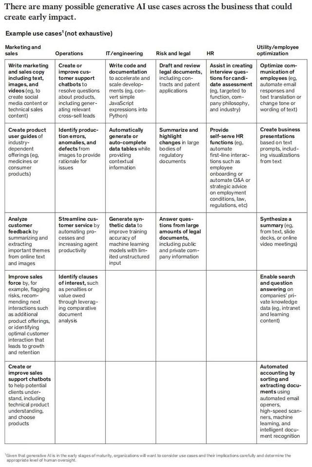 在这篇文章中,麦肯锡预测了生成式AI在营销、销售、运营、IT/工程、法务、人力资源和公用事业/员工优化等领域的预期价值创造。