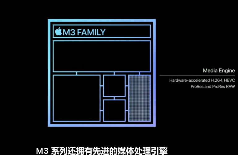 首先是M3系列芯片,这是本场发布会的重头戏,被安排在发布会的第一个环节。这是Mac芯片首次采用3纳米进程,整体性能和图形处理能力较前两代有明显提升。