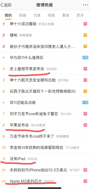 人们对苹果发布会的关注度仍然很高。在今晨,有关苹果发布会的多个词条登上微博热搜,包括“苹果发布会”“没有iPad”“Apple M3系列芯片”。库克早晨6点发微博预告发布会,两个小时就已经有500多条评论。