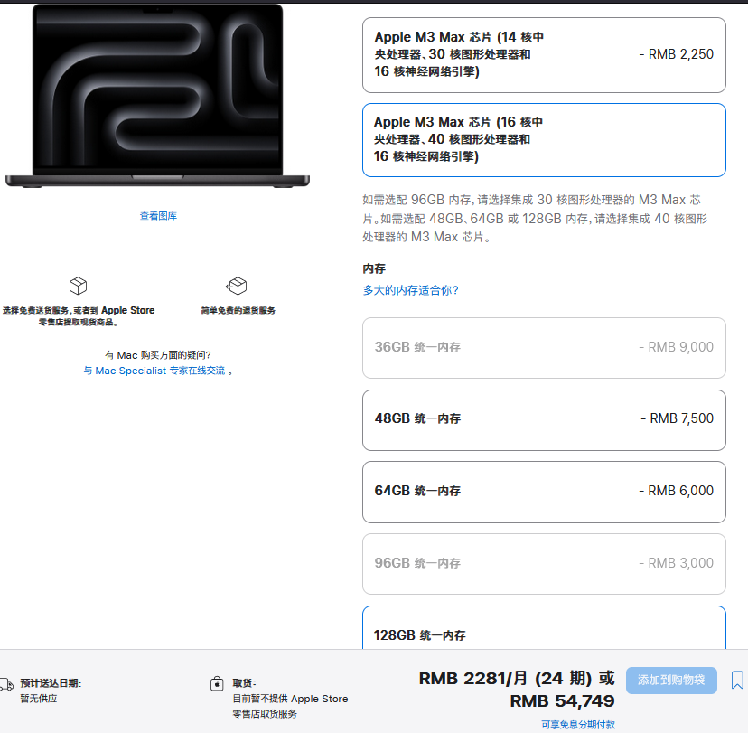 其中14英寸Macbook Pro起售价1599美元(约合人民币11700元),16英寸起售价2499美元(约合人民币18300)元。若想拥有苹果最先进的M3 Max芯片的14英寸Macbook,价格24999元起,如果选择了最高配(16核CPU版本、128GB统一内存、8TB固态硬盘),售价超过5万元。