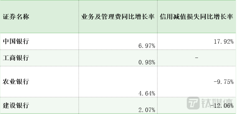中行的业务及管理费同比增长率及信用减值损失同比增长率均为四大行最高,这也造成了,虽然中行的营收在四大行中表现突出,净利润增幅却比较一般。