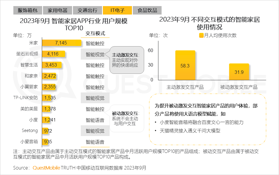 Ⅸ. 现阶段智能家居用户规模TOP10产品中,被动激发交互产品居多,用户对该产品的使用粘性弱于主动激发交互产品,为提升改善用户体验,大语言模型将赋能被动激发交互智能家居产品