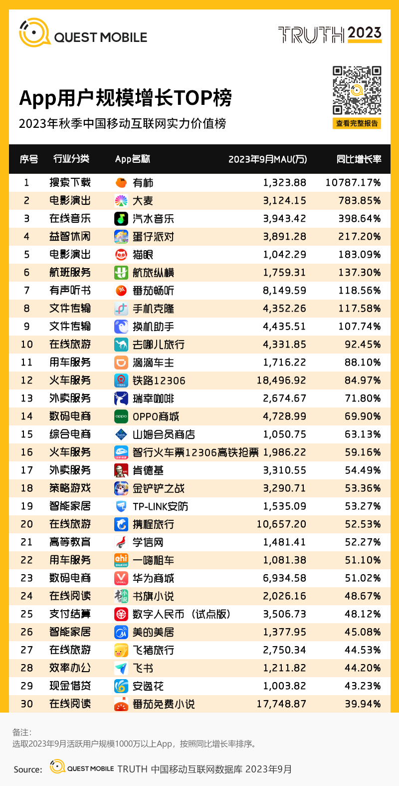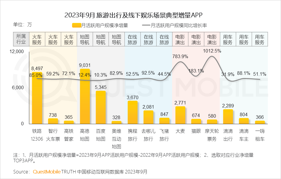 总体上看,在整体经济复苏势头和暑期效应叠加下,Q3移动互联网行业呈现出“消费复苏”“文旅井喷”“娱乐红火”等三大特点,在2023年9月中国移动互联网细分行业月活用户规模净增量中,火车服务、地图导航、在线旅游、有声听书、数码电商位居前五,分别净增8602万、8587万、5017万、4261万、4062万。具体到APP上看,高德地图、铁路12306、百度地图、携程旅行、大麦用户分别净增了9031万、8497万、5345万、3670万、2771万。