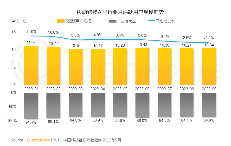 1.3 平台流量侧:电商总流量增长放缓,平台转向培育存量用户,着重拉高核心人群用户黏性Ⅰ. 移动购物APP行业月活跃用户规模整体增速放缓,进入存量时代,前三季度,移动购物APP行业活跃渗透率整体维持在84%左右![]()