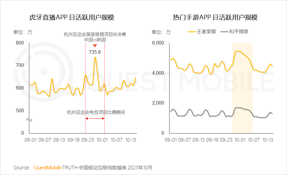 Ⅴ. 虎牙拿下亚运会转播权,搭配人气主播、专业解说全程直播,热门比赛日流量激增,此外央视直播增强新观众对电竞项目的认知,叠加国庆假期因素,热门手游APP流量出现小高峰