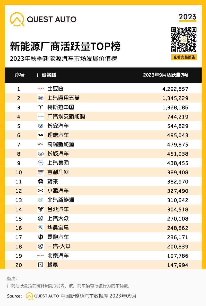 中国新能源汽车数据库QuestAuto数据显示,截止2023年9月,比亚迪、上汽通用五菱及特斯拉中国厂商汽车活跃量均超百万辆,分别达到429.29万辆、134.52万辆及132.82万辆。
