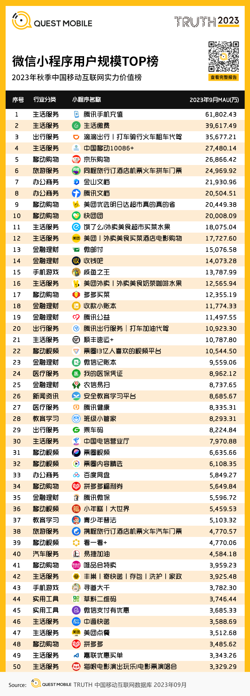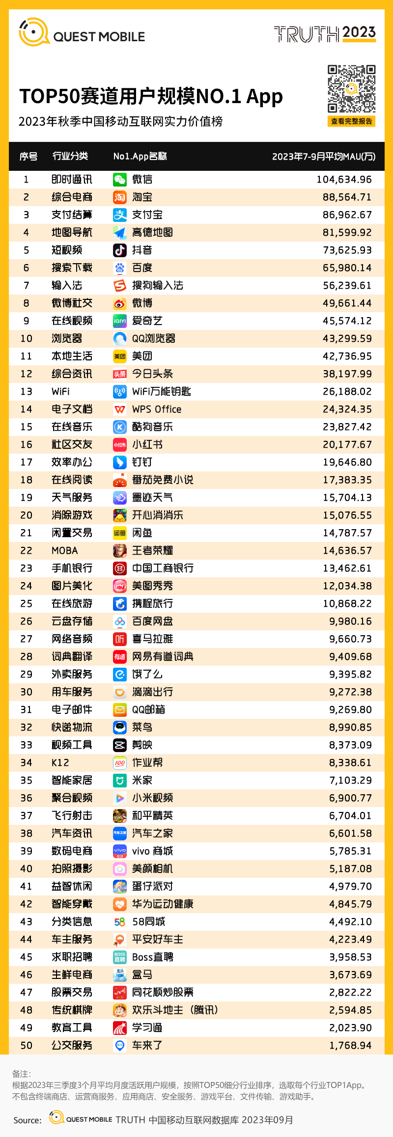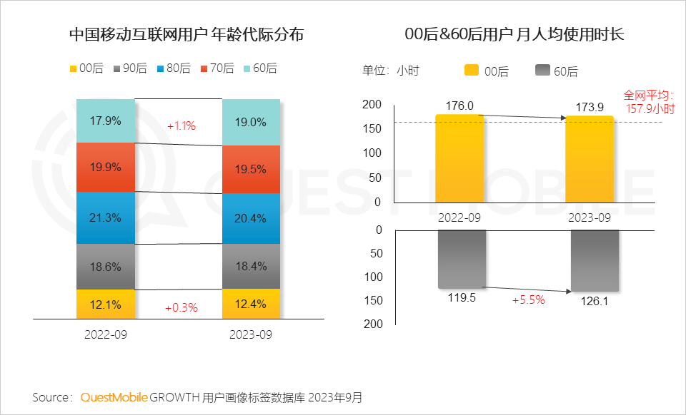 1.4 00后、60后用户持续数字化渗透中,成为移动互联网主要增长源QuestMobile2023年9月数据显示,00后、60后用户较去年同期占比分别提升了0.3个百分点和1.1个百分点,00后月人均使用时长达173.9小时,明显高于全网平均的157.9小时,60后用户人均使用时长126.1小时,同比提升5.5%。![]()