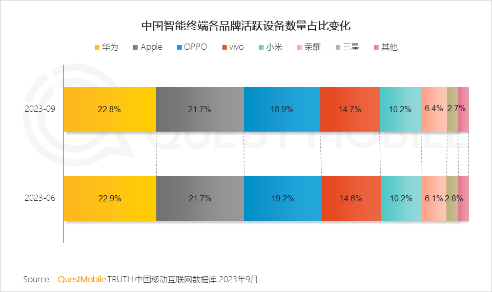 QuestMobile数据显示,截止2023年9月,智能终端品牌活跃设备占比中,华为、Apple、OPPO、vivo及小米分别为22.8%、21.7%、18.9%、14.7%及10.2%,较上季度末保持基本稳定。