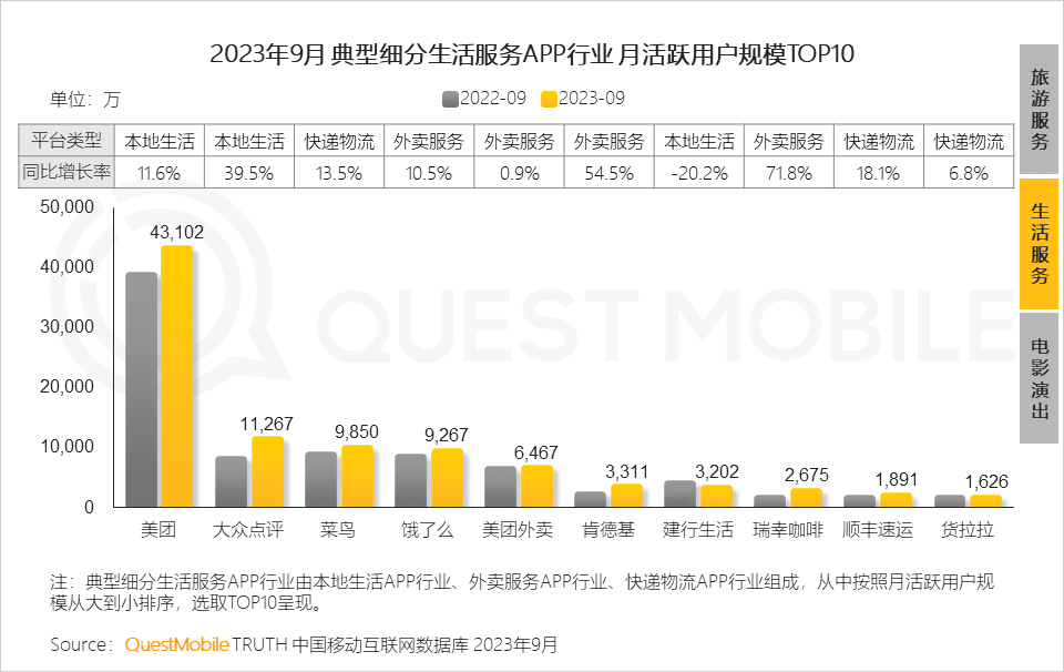 2.5 2023年以来,生活服务行业活跃用户规模稳居8.2亿以上,随着配送能力及效率的提升,促进本地生活、外卖服务、快递物流APP行业均实现用户规模的增长