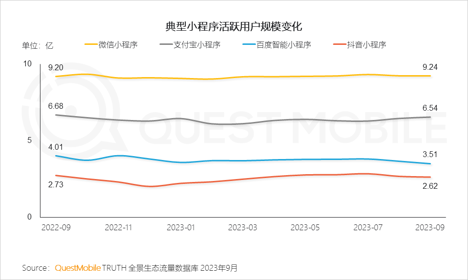 4.1 小程序流量入口逐渐稳固,各家小程序活跃用户规模保持在稳定的发展态势,较晚入局的抖音小程序流量已长期稳定在2.5亿以上