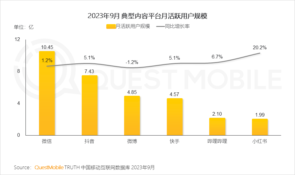 QuestMobile2023年9月数据显示,微信、抖音、微博、快手、哔哩哔哩及小红书APP覆盖用户规模分别达到10.45亿、7.43亿、4.85亿、4.57亿、2.10亿及1.99亿,其中,小红书、哔哩哔哩、抖音及快手增速表现亮眼,同比增长率分别为20.2%、6.7%、5.1%和5.1%。