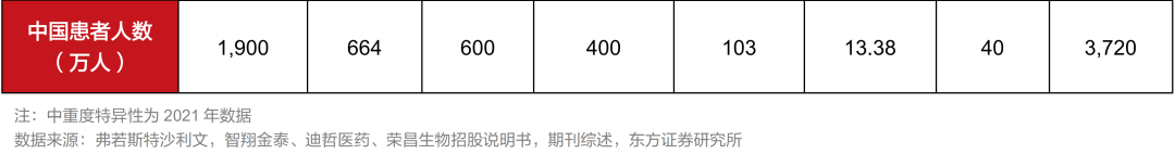 银屑病(俗称牛皮癣):国内患者人数664万,中重度斑块状银屑病患者超110万。据《中国银屑病诊疗现状2020蓝皮书》,银屑病高发于青壮年,19-44岁年龄段患者占54%。