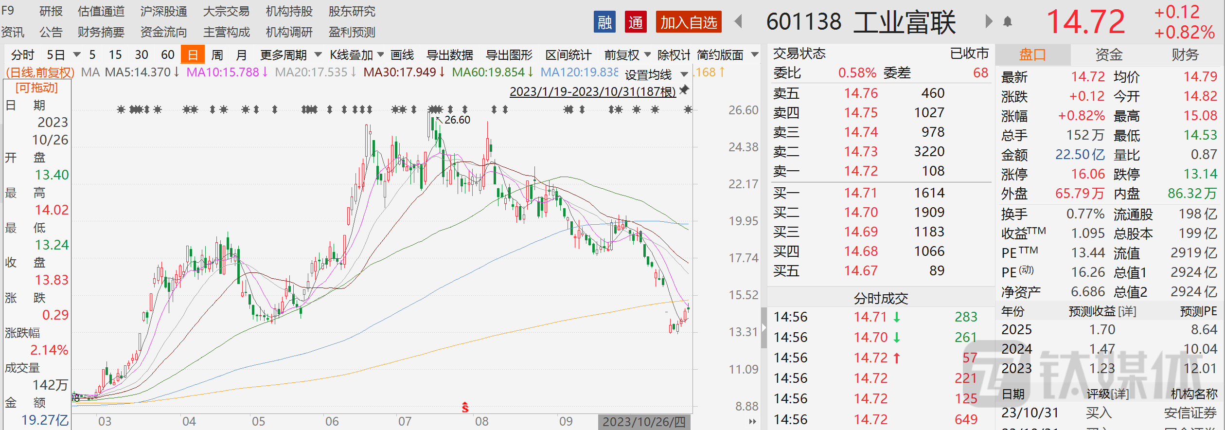 通过对比公司过往财务数据发现,今年第三季度和前三季度盈利水平均创下上市以来历史同期新高。不过,二级市场投资者对此貌似并不买单。今日公司股票高开后冲高回落,截至10月31日收盘,公司股价收报14.72元,上涨0.82%,总市值2924亿元。