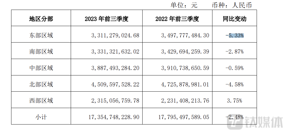 海天味业前三季度仅西部区域收入实现增长,其他地区如东部、南部、中部、北部的营收全线下滑,其中东部和北部地区下滑较为严重,其营收分别为33.11亿元、45.1亿元,分别下滑了5.33%、4.58%。