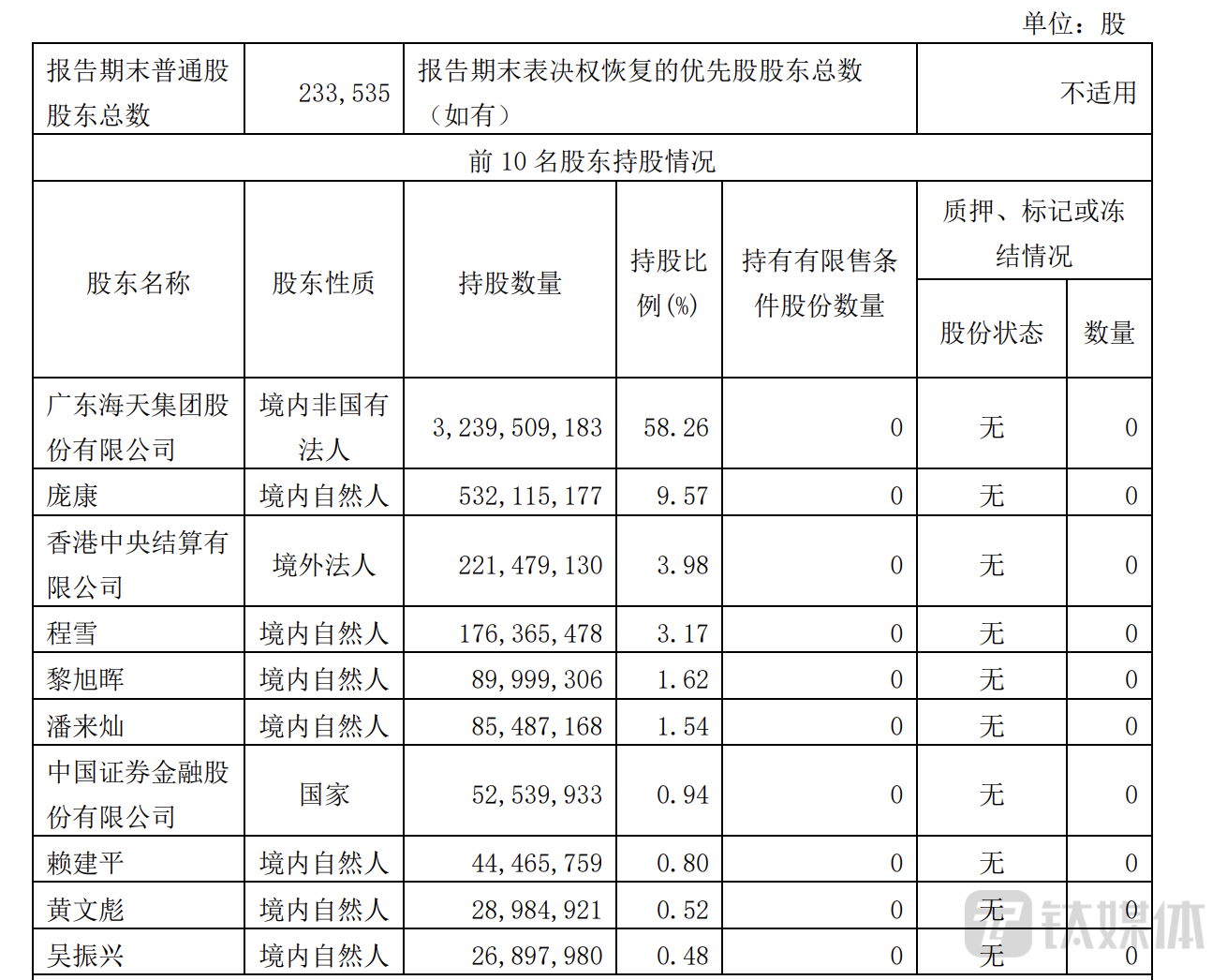 业绩不佳之际,海天味业的大股东开始抛售所持股票。据公司披露的2023年三季度报告显示,海天味业第三大股东香港中央结算有限公司持股比例由年初的6.66%下降至3.98%,共减持8719.94万股。