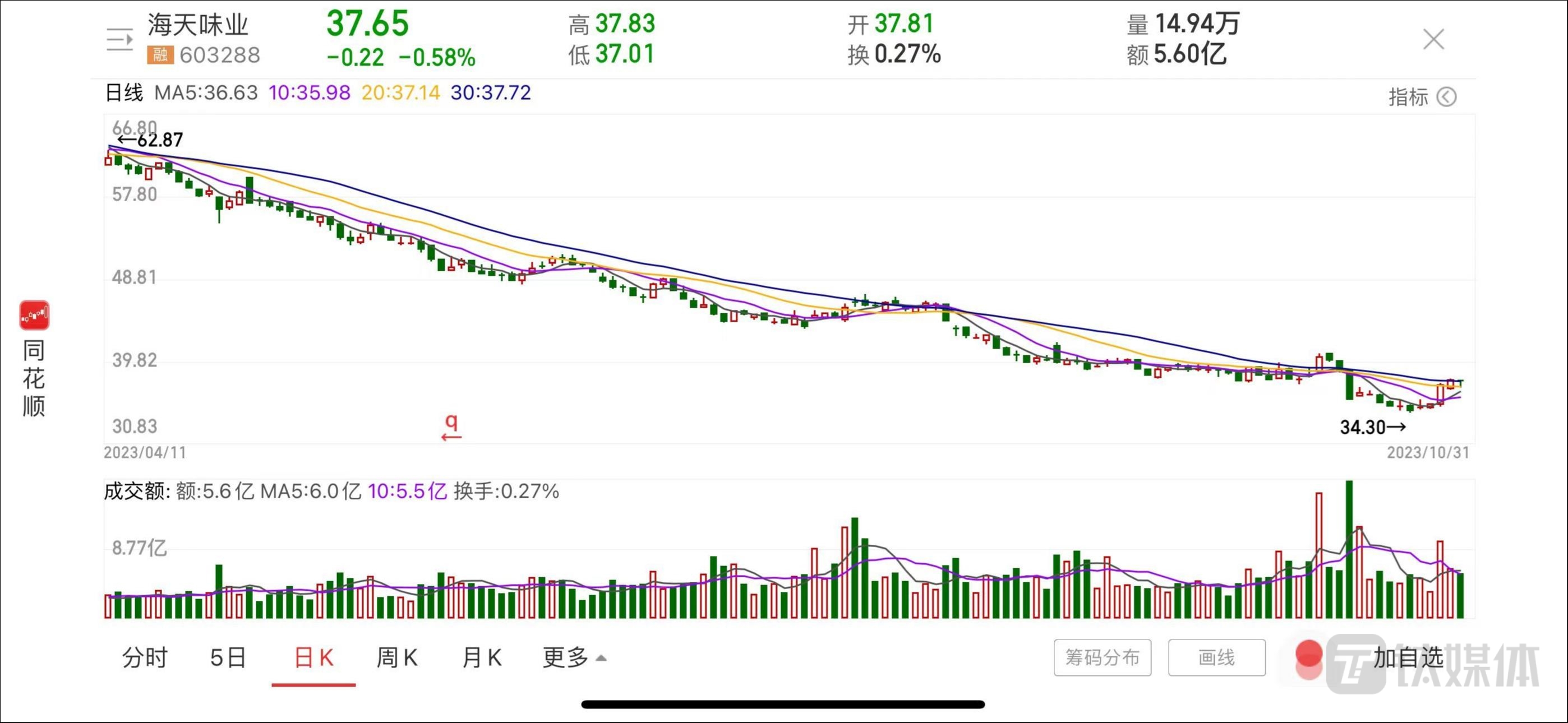 二级市场方面,截至10月31日收盘,海天味业股价报收37.65元,跌幅为0.58%。值得一提的是,自2023年第一个交易日至今,公司股价已累计下跌42.74%,当前总市值为2094亿元。