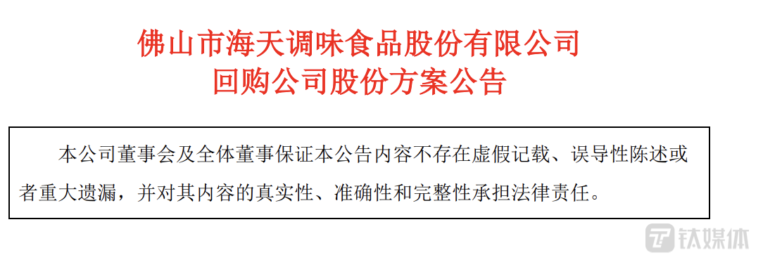 目前,该方案已审核通过,公司发布三季报的同时,发布了回购股份的具体方案。公告显示,公司拟以自有资金实施股份回购,回购价格不超56.6元,回购金额不低于5亿元且不超8亿元。以海天味业今日(10月31日)收盘价37.65元来看,本次回购价格溢价约50%。