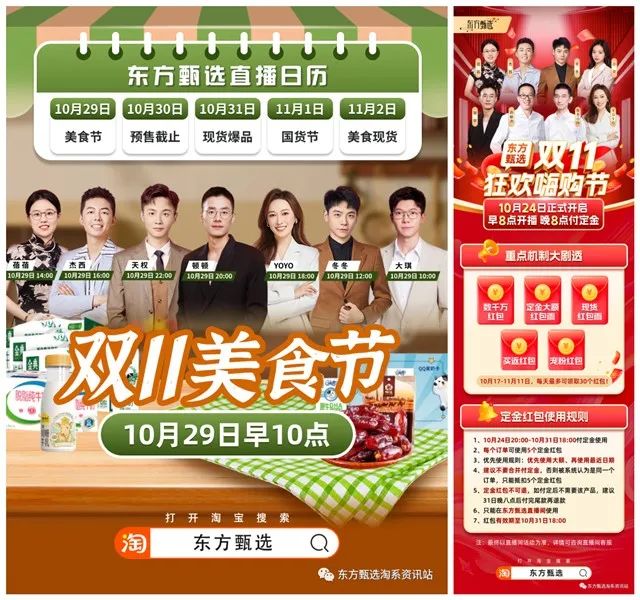 董宇辉不在淘宝直播阵容海报中,在近期直播中,也只是参加了东方甄选看世界账号的无锡行直播。面对双十一,东方甄选最有流量、最具话题的主播并没有产生很强参与感。