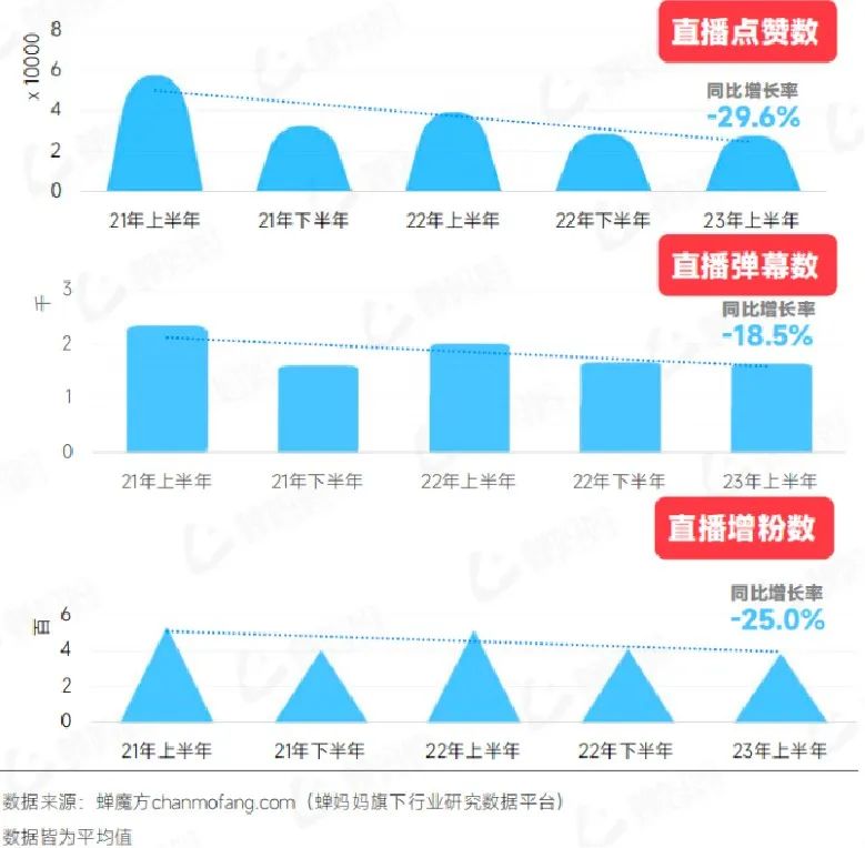 蝉妈妈《2023抖音电商半年报》显示,上半年抖音电商直播间点赞数、弹幕数同比增速,分别为-29.6%、-18.5%,观众互动意愿降低、停留时长缩短。