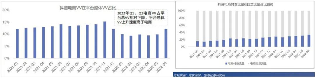 据专家纪要,2022年起,抖音电商流量占比从13%降到9%+;同时,其中的付费流量占比不断提升。