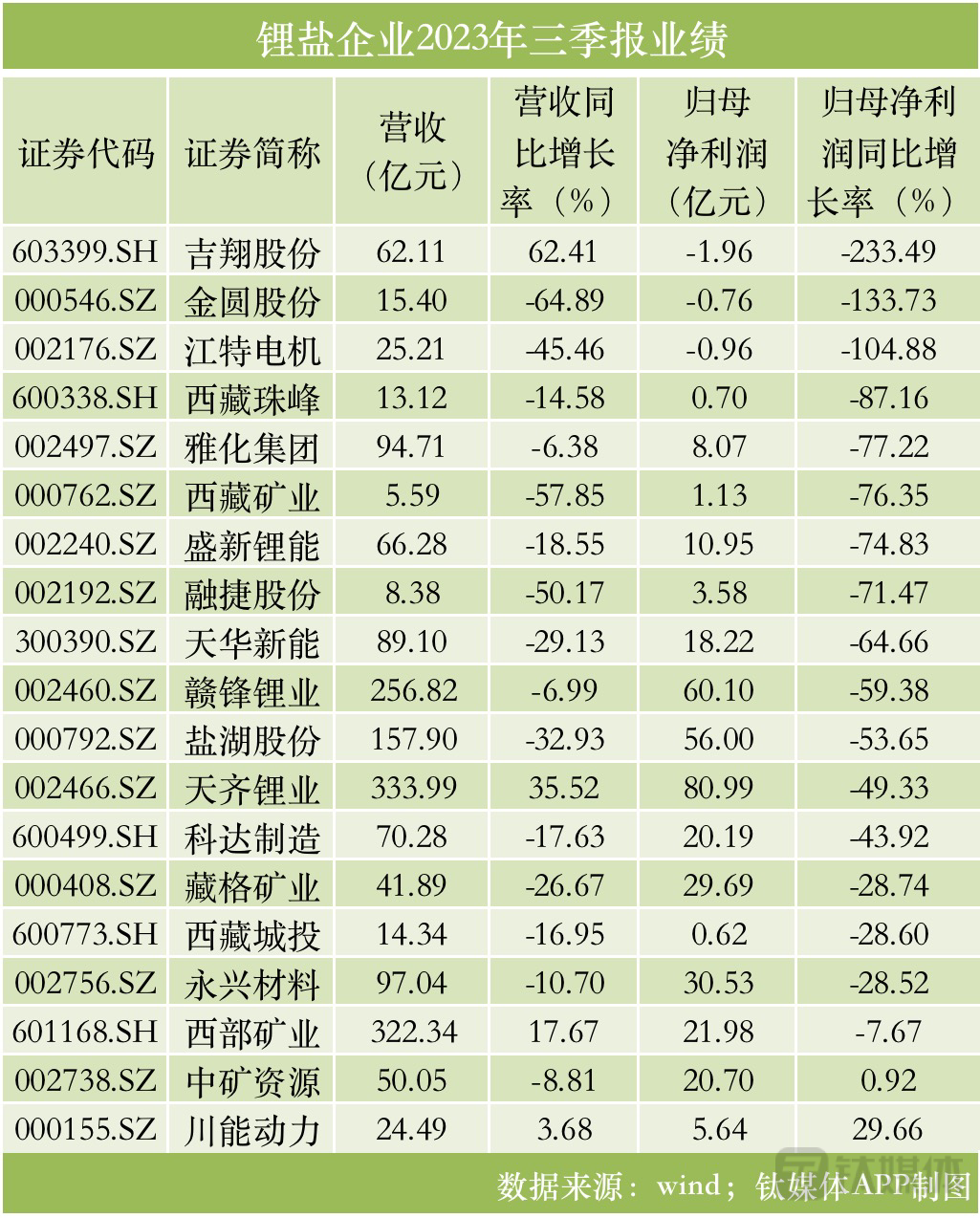 无独有偶,前三季度,盛新锂能(002240.SZ)营收、归母净利润各录得66.28亿元、10.95亿元,同比下降18.55%、74.83%;融捷股份(002192.SZ)营收、归母净利润各8.38亿元、3.58亿元,同比下降50.17%、71.47%。