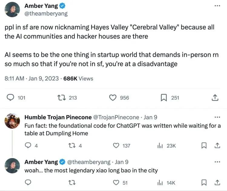 他们带着信仰涌向这里,期待用AI赋能和革新世界。Hayes Valley也因为聚集了来自全世界各地的AI从业者而被人们称为“脑谷(Cerebral Valley)”。