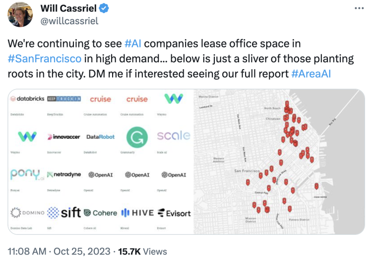 网友在社交网站表示,越来越多的AI公司在旧金山租赁办公空间。