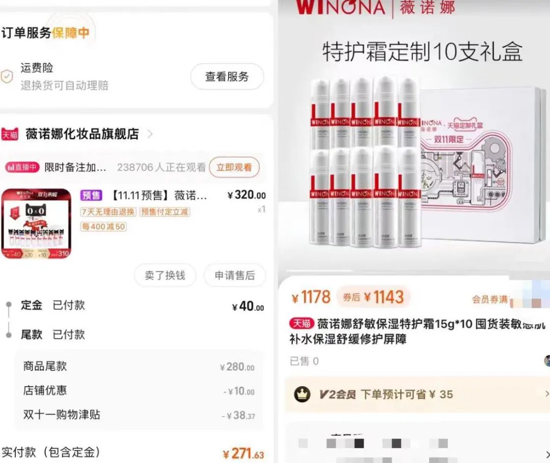 图|同一款薇诺娜产品20年双11价格 VS 23年双11价格