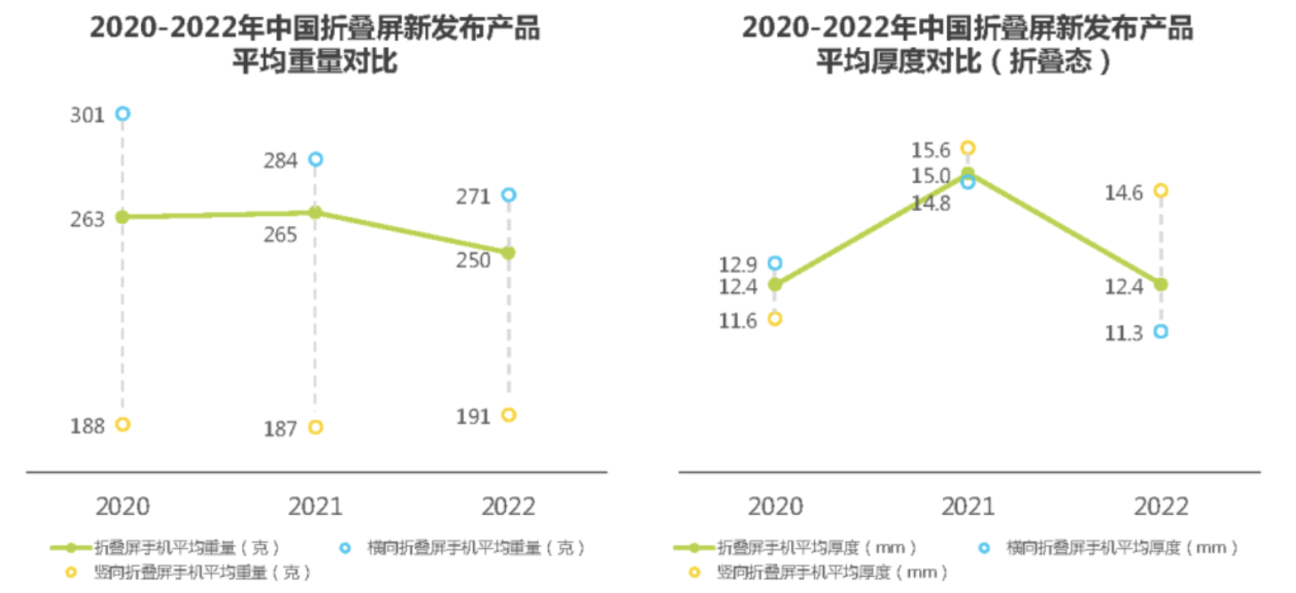 根据艾瑞咨询相关报告,轻薄是现有折叠屏手机用户的重点关注因素。毕竟,折叠屏旗舰想要全面替代直板旗舰,则需要拉近与直板机旗舰的差距,重量和厚度是最直观的指标。就横向折叠屏手机市场来看,近两年相关产品平均重量下降30g,折叠态平均厚度减薄1.6mm,已不断朝着轻薄化的方向发展。