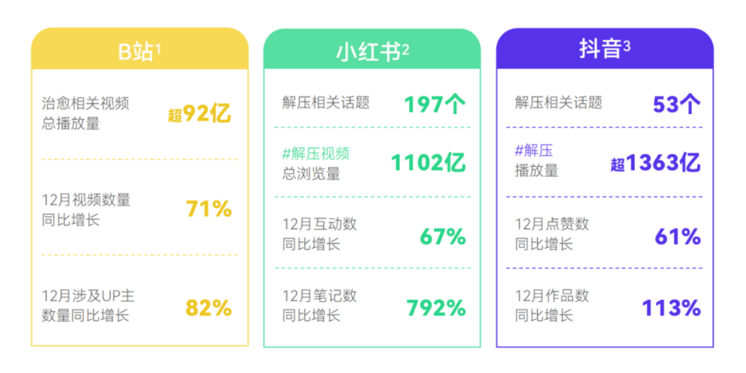 像她们一样饱受巨大精神压力的人不在少数。近一个月内,小红书与“焦虑”相关的笔记达到22.82万条。在新榜发布的《2023年消费趋势报告》中,“情绪治愈”成为重要的消费趋势之一,B站治愈相关视频的总播放量超过92亿,小红书解压视频的总浏览量为1102亿,抖音上“修牛蹄”、“切肥皂”等解压题材视频更是成为用户的心头好。