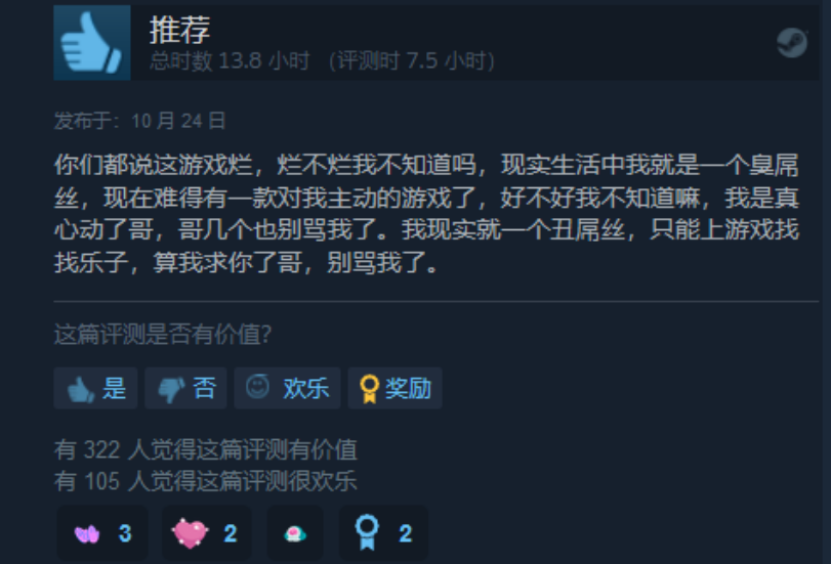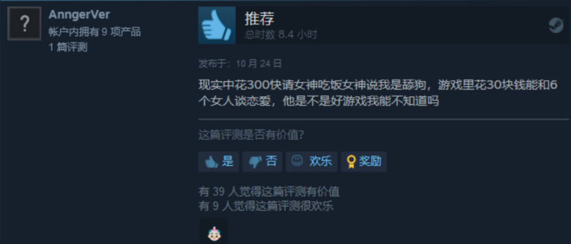 这一点,也能从另一款针对男性推出的恋爱游戏《恋爱模拟器》被愤怒的宅男打差评得到佐证。这款游戏比《完蛋》更模拟现实,强调了恋爱中“舔狗”们的卑微和无能为力,戳中宅男们的怒点。