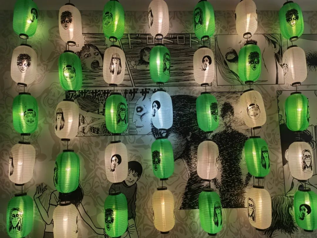 伊藤润二可能是和万圣节最配的漫画家之一。位于朝阳大悦城3楼的伊藤润二快闪展被布置成一条由漫画场景装饰的走廊,复刻了浴缸、烧肉店、美少年占卜、富江画廊等漫画中的经典场景,也有NPC可以互动拍照。走廊尽头是限定周边店,销售立牌、徽章等周边。