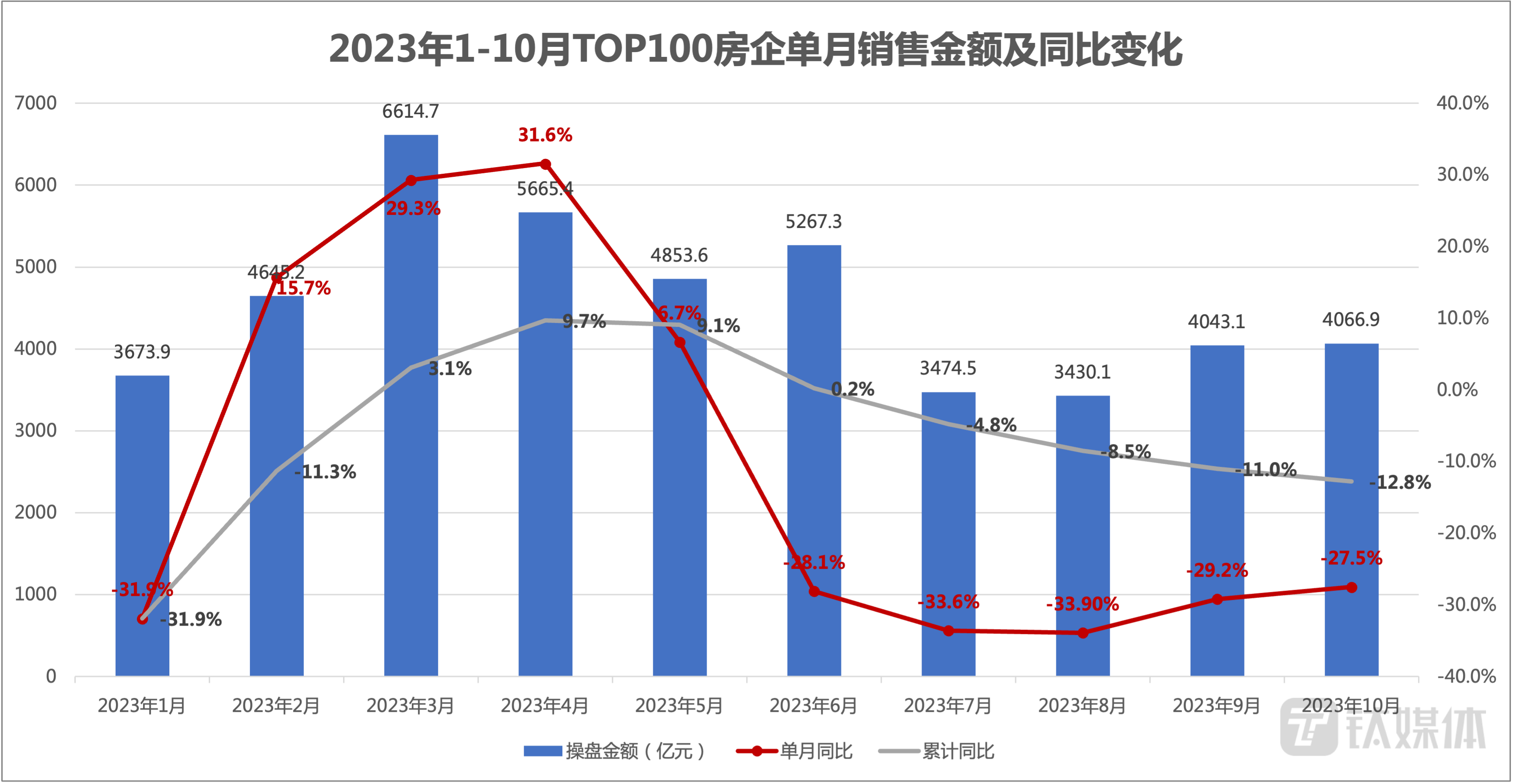 房企层面,据克而瑞最新统计, TOP100房企2023年10月单月操盘金额为4066.9亿元,环比微增0.6%,同比降低27.5%,同比降幅有所缩窄,但仍保持在较高位。百强房企单月业绩规模延续下半年以来的低位。