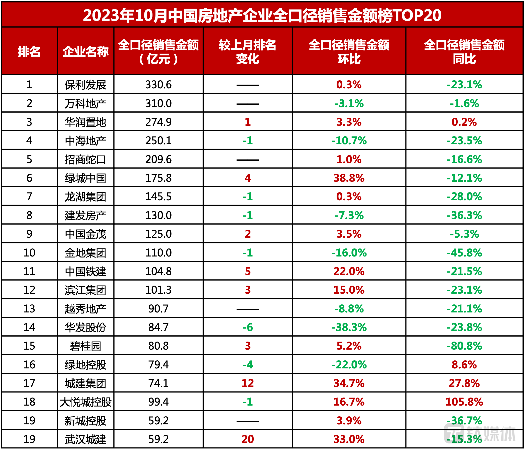 据最新发布的10月全口径销额榜单,保利、万科、华润分别位列榜单前三名且突破250亿,中海地产、招商蛇口突破200亿,分别位列第四、第五位。近六成百强房企单月业绩环比降低,20家百强房企的单月业绩环比降幅大于3成,40家的环比降幅在3成以下。但同时,也有一些企业的业绩表现相对突出。如绿城中国、碧桂园、中国中铁、路劲集团、联发集团等10月均实现了单月业绩环比增长。从业绩同比来看,目前规模房企整体仍陷负增长困局,10月单月和累计业绩同比降低的企业数量均达到近八成。