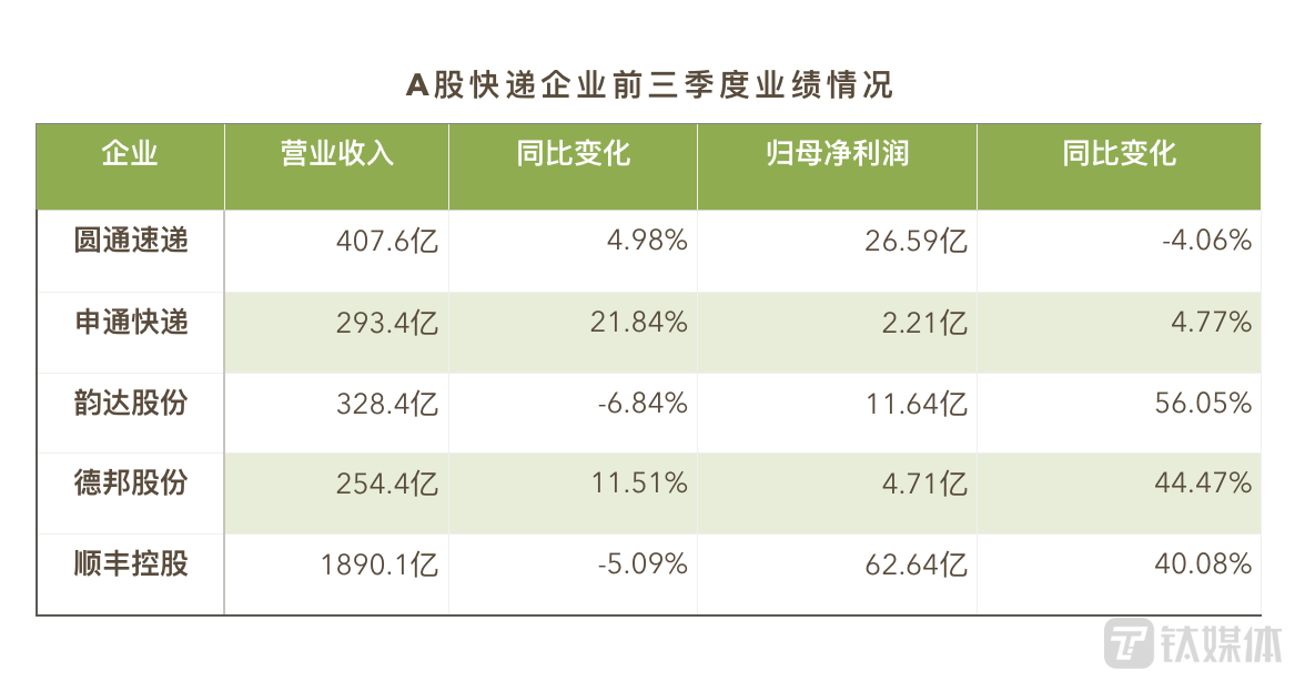 从前三季度整体情况来看,国家邮政局数据显示,快递业务业务量和业务收入分别完成931.2亿件和8545.5亿元,同比分别增长16.4%和11.1%。A股快递企业中,仅申通快递、德邦股份营业收入增长速度超过行业增速。