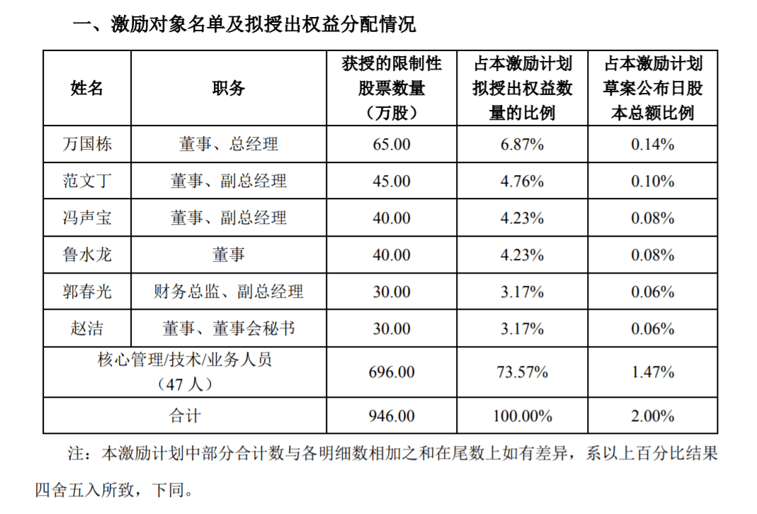 激励计划显示,激励对象包括公司总经理万国栋、董事兼副总经理范文丁和冯声宝、董事鲁水龙、财务总监郭春光、董秘赵洁,以及47位核心管理/技术/业务人员。