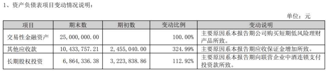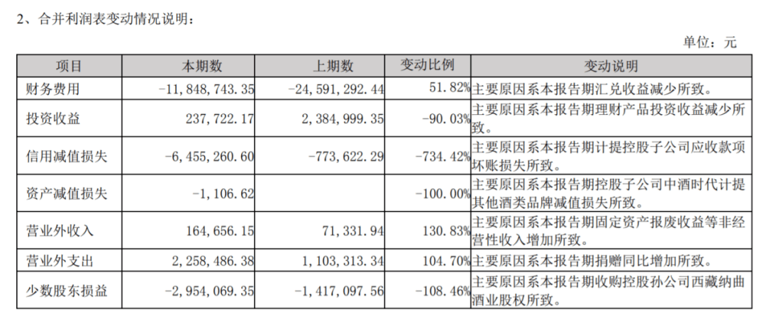 此外,控股子公司中酒时代计提其他酒类品牌减值损失也导致资产减值100%;投资收益大幅缩水90.03%;捐赠增加导致营业外支出大增104.7%;美元汇率变动导致少数股东亏损108.46%。