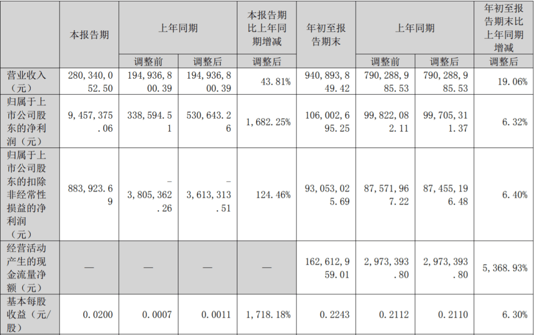 其中第三季度,天佑德酒营收2.80亿元,同比上升43.81%;净利润945.74万元,同比上升1682.25%;扣非净利润88.39万元,同比上升124.46%。