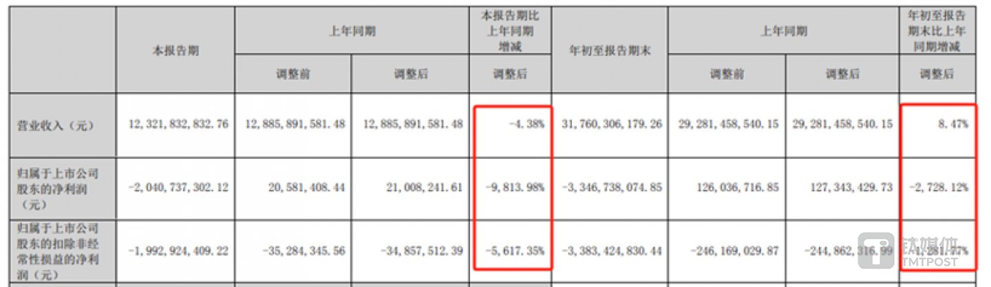 前三季度,公司营业收入317.60亿元,同比增长8.47%;归母净利润-33.47亿元,同比减少2728.12%。