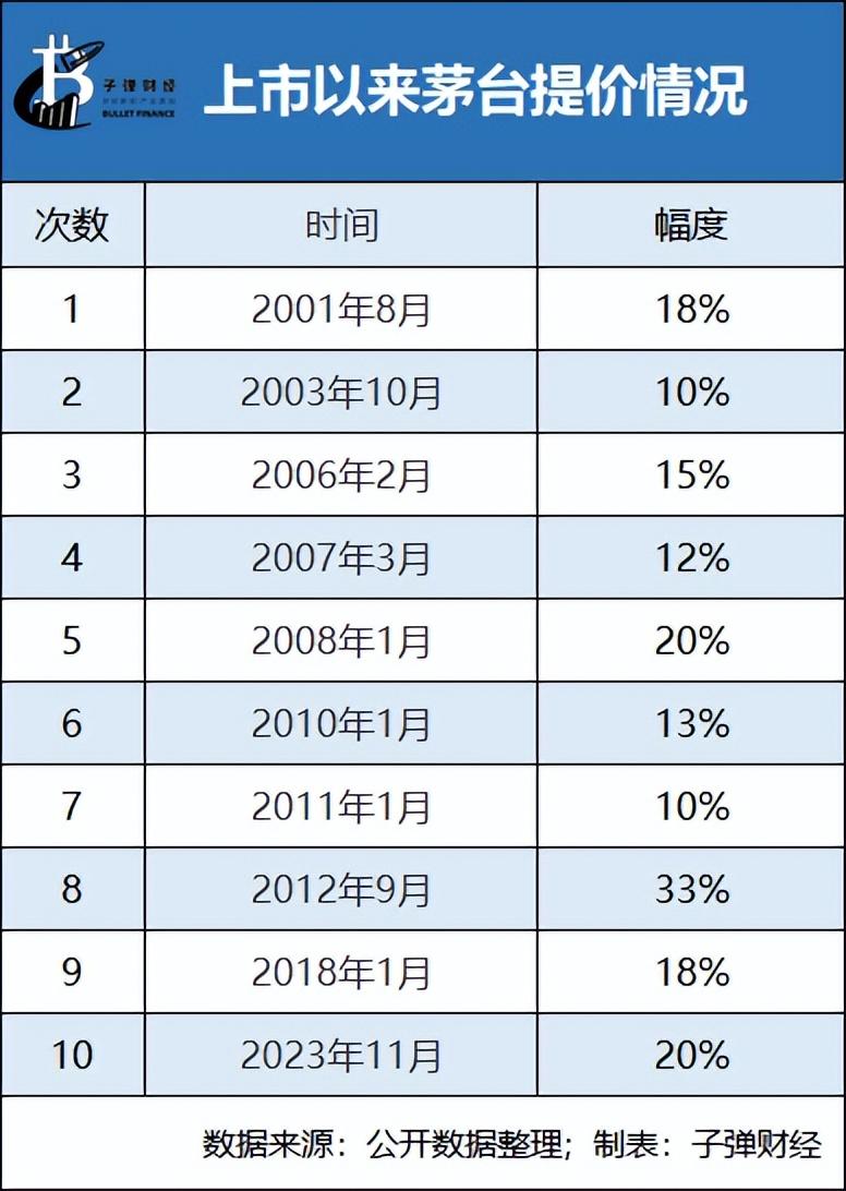 这是茅台上市以来第十次上调出厂价,之前的调价时间分别在2001年、2003年、2006年、2007年、2008年、2010年、2011年、2012年、2018年,调整幅度在10%-33%区间。
