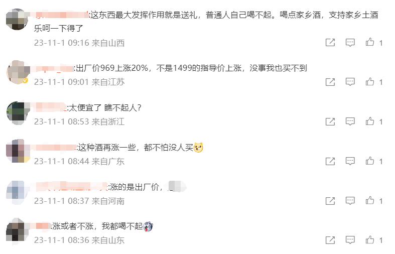 有微博网友表示“这种酒再涨一些,都不怕没人买”“涨或者不涨,我都喝不起”“出厂价969上涨20%,不是1499的指导价上涨,没事我也买不到”。