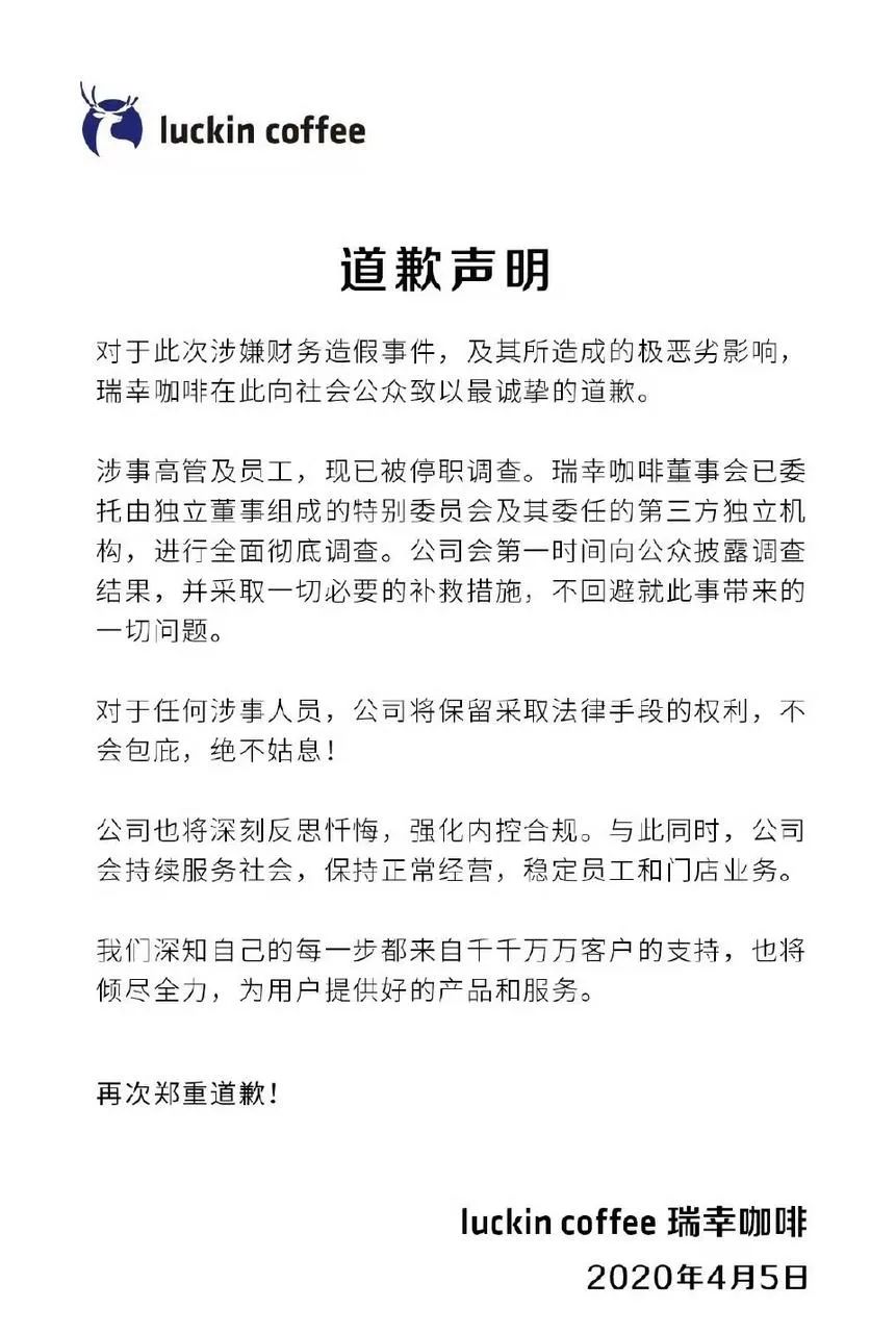 2017年瑞幸开设第一家门店,凭借着不断融资,疯狂撒钱,开拓市场,仅仅18个月就上市了。可2020年4月2日,瑞幸咖啡突然发布公告,承认虚假交易22亿人民币,股价暴跌80%,盘中数次暂停交易。4月5日,瑞幸咖啡发布道歉声明。