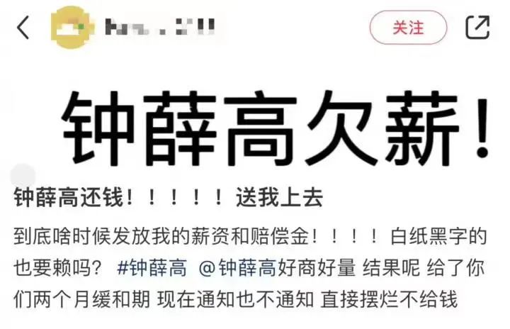 相关帖子显示,钟薛高因效益不好选择优化部分员工,但员工在签订补偿金协议后,迟迟未收到相关款项且没有明确的时间表。有网友称:“薪资和赔偿金的拖延时间已经超过了两个月,且不只是离职员工,在职员工的薪资也被拖欠”。