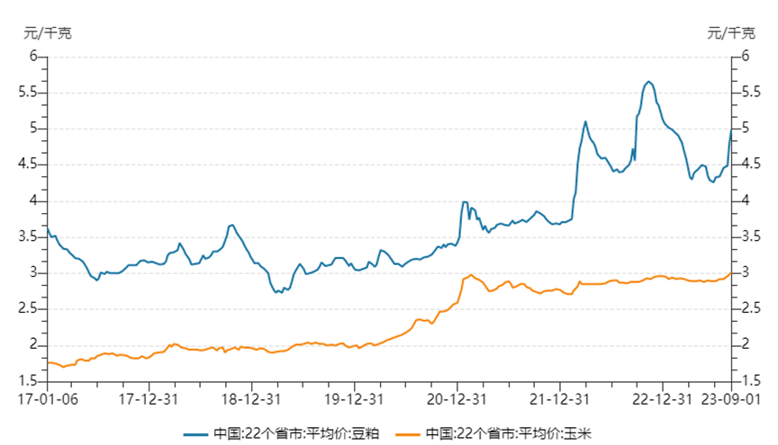 2017年至今豆粕和玉米价格走势图,来源:Wind
