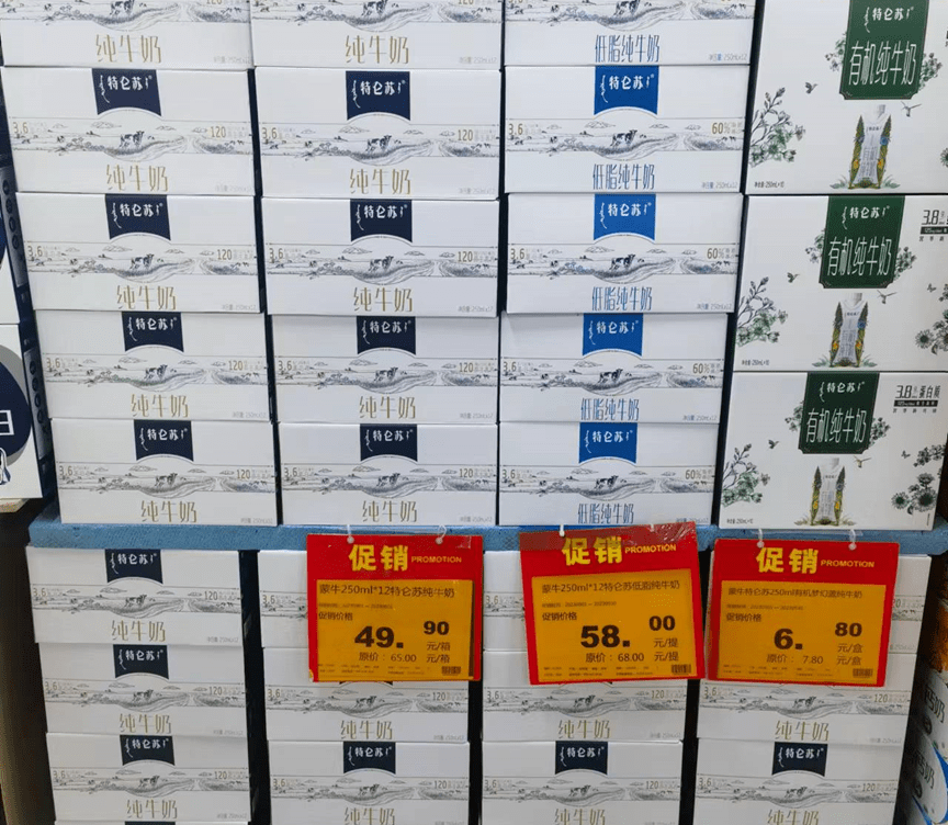 在北京市朝阳区的一家物美超市内,原价65元/箱的三元二代极致全脂纯牛奶,折后价为39.9元/箱;原价76元/箱的伊利金典纯牛奶礼盒装,折后价为54.9元/箱;原价65元的特仑苏纯牛奶,折后价为49.9元/箱。而且这些牛奶都是近几个月生产出的、非滞销的临期产品。