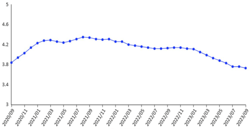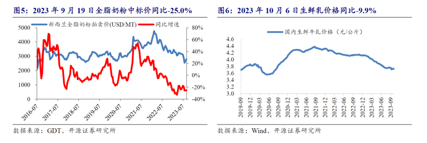 2020年之前,牛奶价格几年下来平均涨幅约为2.9%,即使过去这三年,平均涨幅也有0.7%。但今年前三季度,乳制品消费似乎进入了“衰退”,奶价持续下行。到了10月第三周,生鲜乳平均价格3.73元/公斤,同比下跌9.9%。