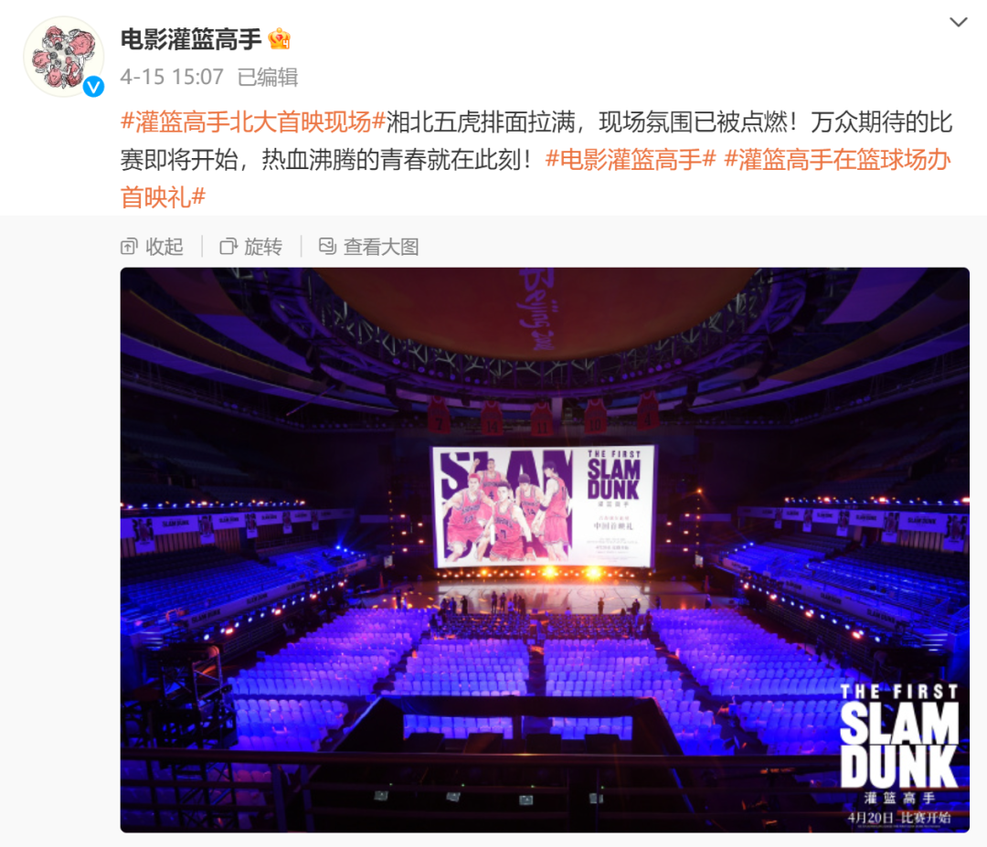 《灌篮高手》的首映礼直接给办成了篮球赛,在北京大学邱德拔体育馆举办。场内27米长的CINITY巨幕,是国内目前最大的移动银幕。上千人将一同领略这场别出心裁的首映礼,两代配音演员相聚,浓缩了两代人的青春记忆。