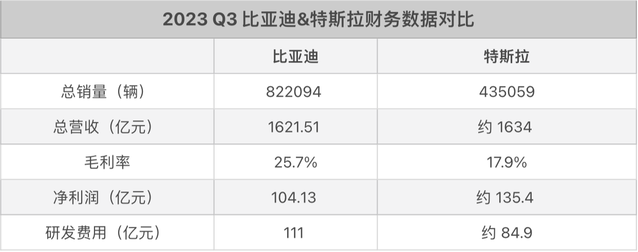2023年第三季度比亚迪&特斯拉部分财务数据对比