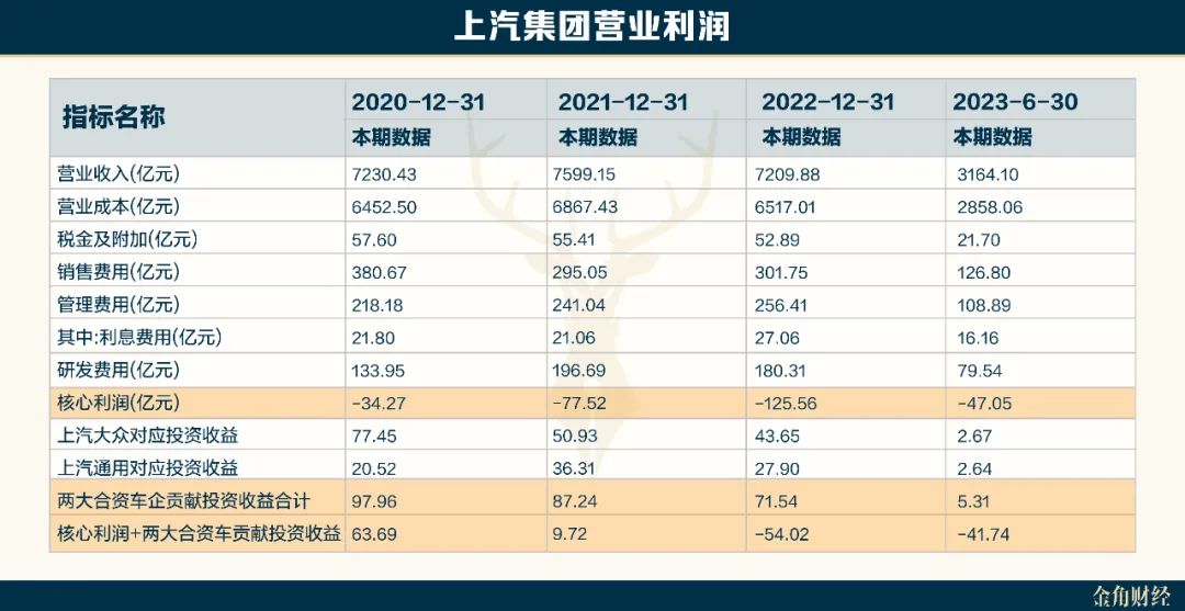 实际上,从近年的财报数据看,上汽集团核心利润(营业收入-营业成本-税金及附加-销售费用-管理费用-利息费用-研发费用)其实都处于亏损状态,亏损金额由数十亿元至过百亿元不等;